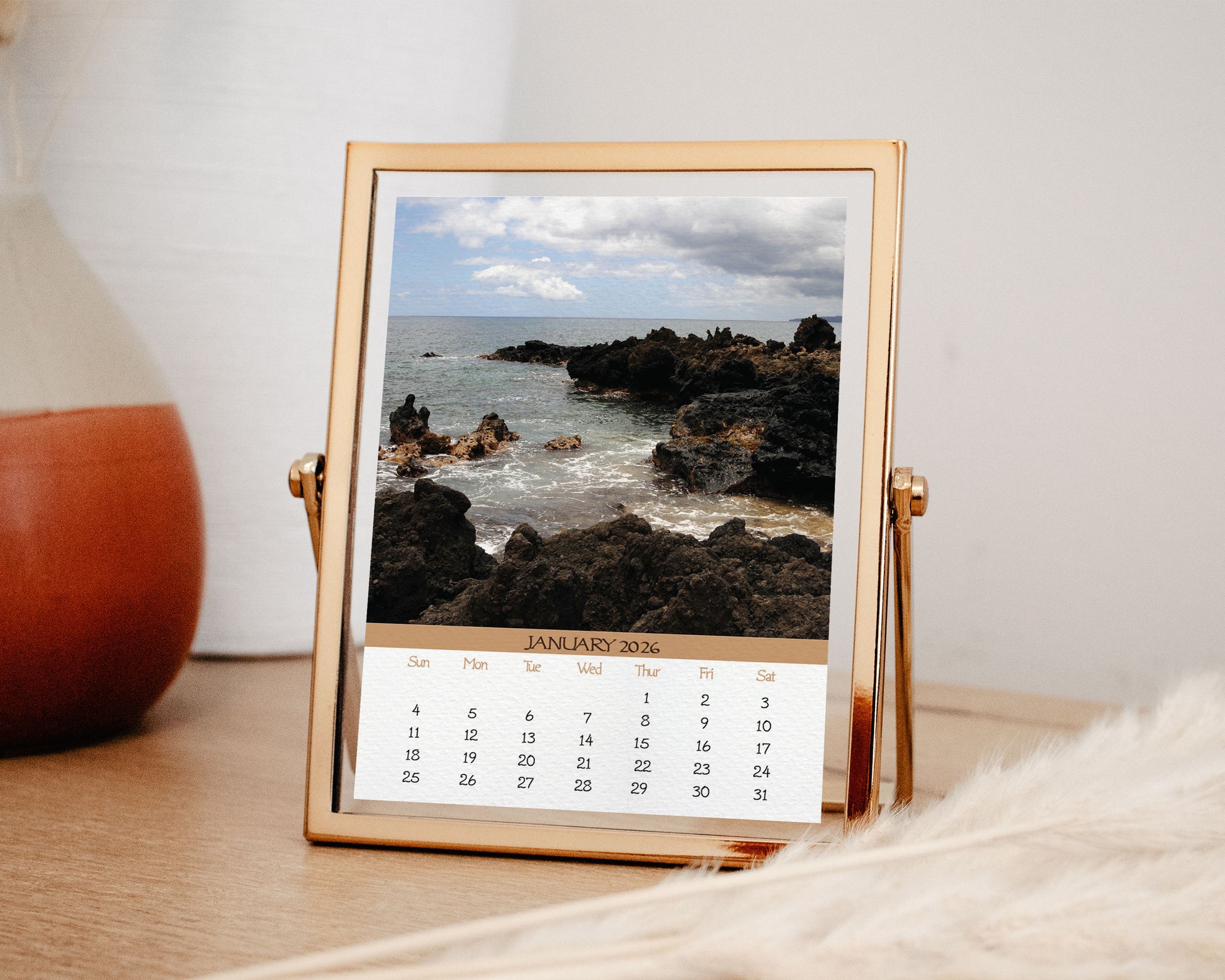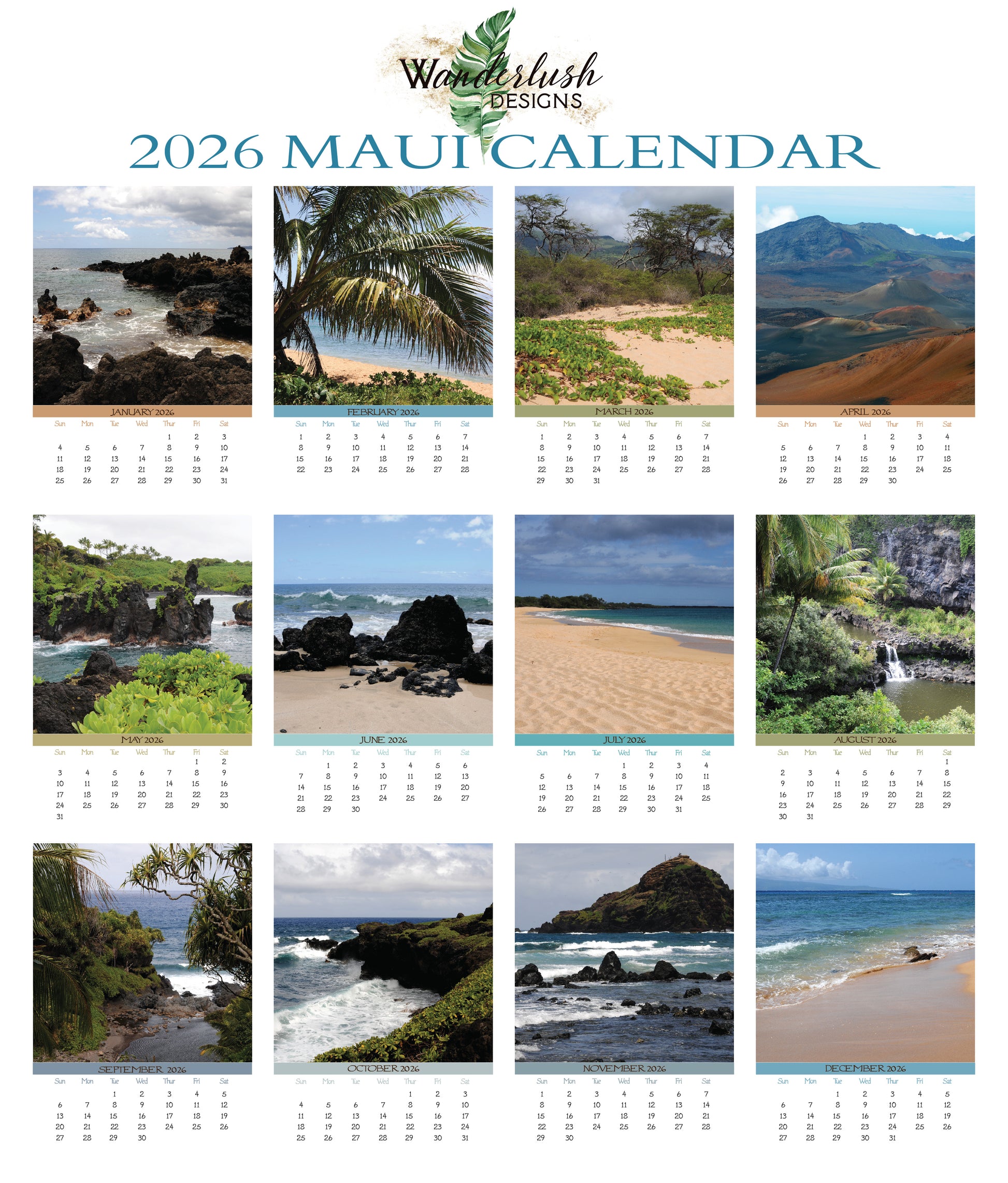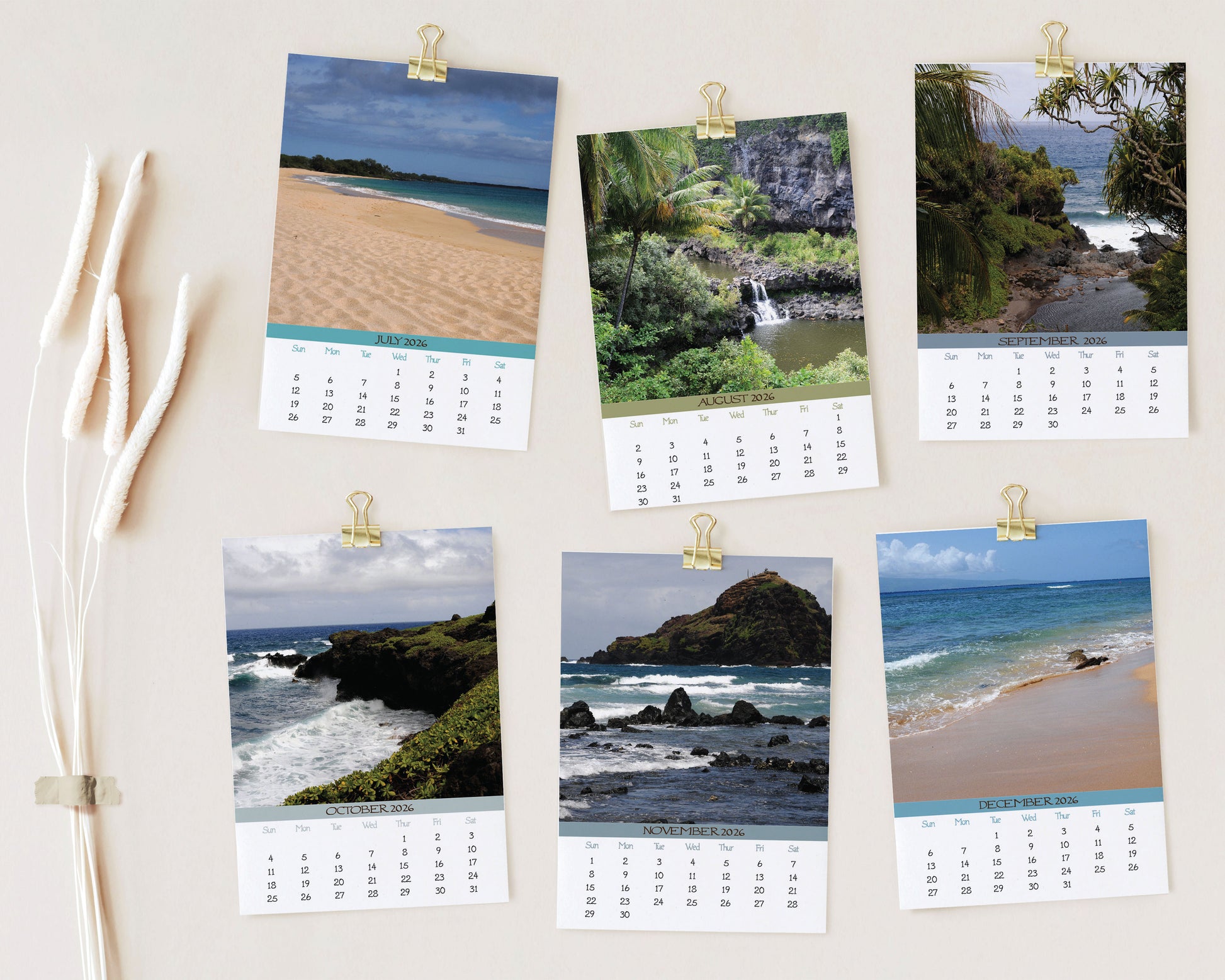 The calendar includes 12 - 5x7 photo pages for each calendar month as well as 1 - 5x7 collage cover. The photos were taken in Maui and showcases the beaches and nature of the country. The photos are full of colour and texture and will be sure to add a sparkle to your environment. The photo size is 5x5" and can be used afterwards as prints.
