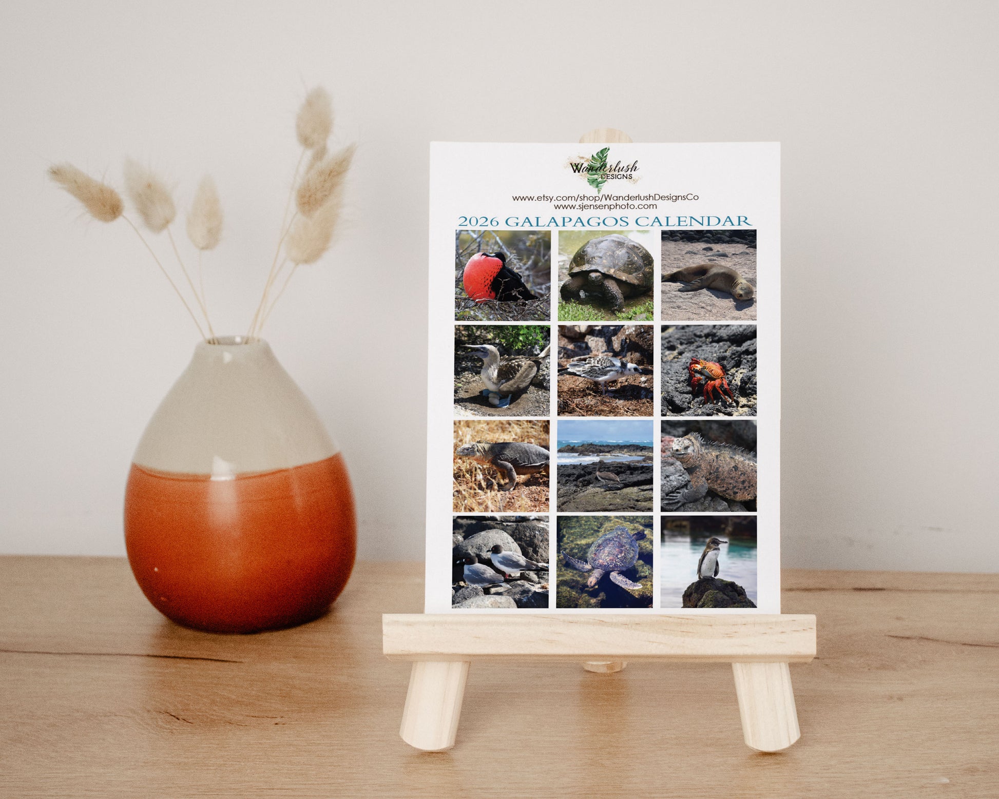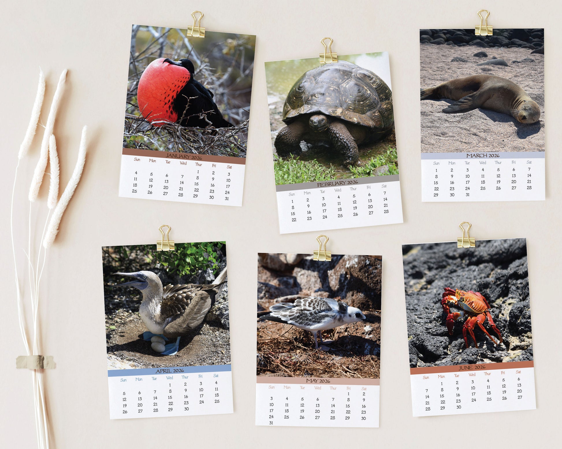 The calendar includes 12 - 5x7 photo pages for each calendar month as well as 1 - 5x7 collage cover. The photos were taken around the three main Galapagos Islands in Ecuador and highlights the various species on the islands. The photos are full of colour and texture and will be sure to add a sparkle to your environment. The photo size is 5x5" and can be used afterwards as prints.