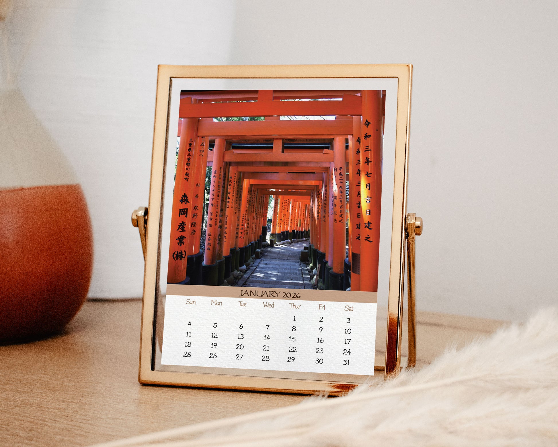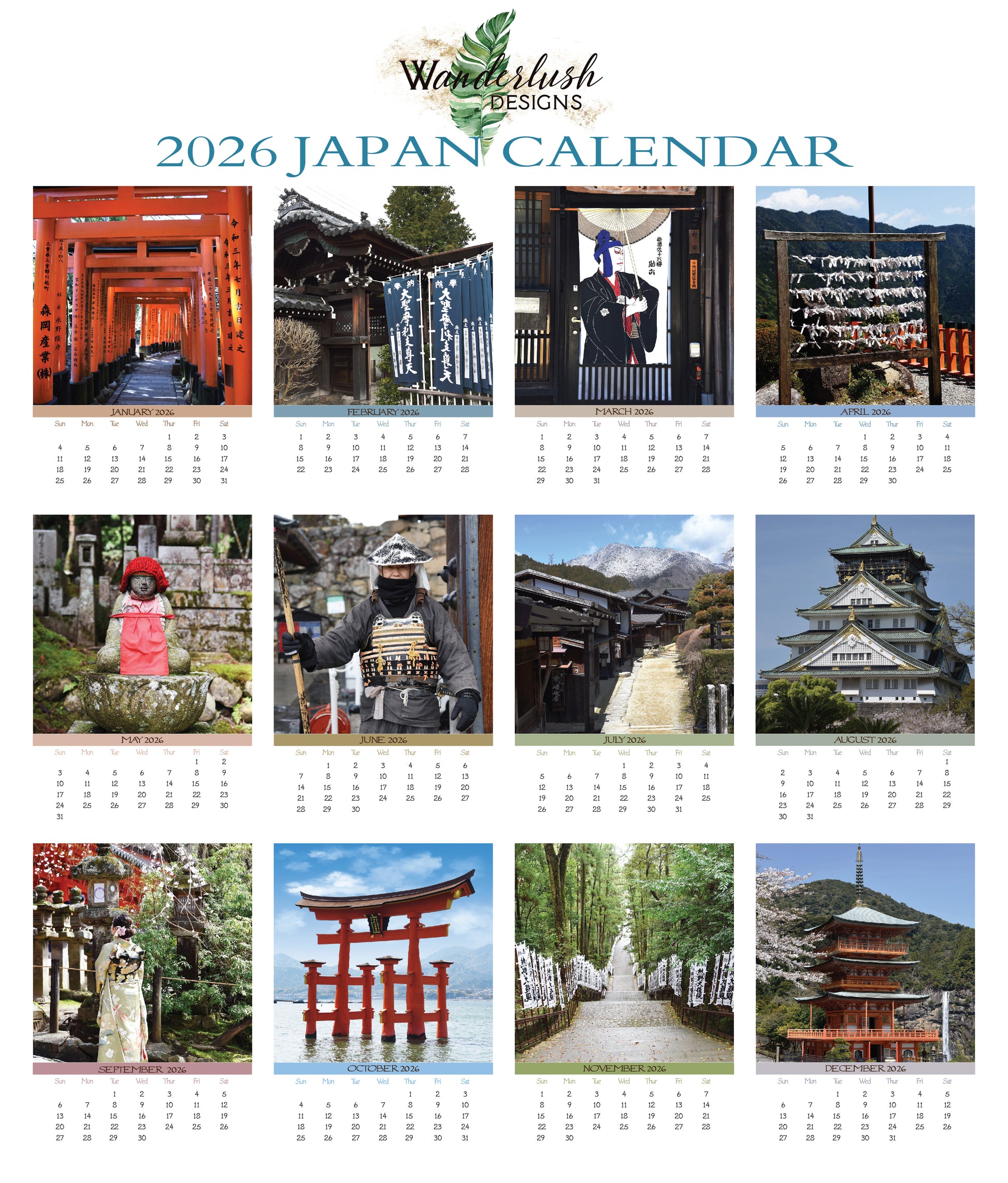 The calendar includes 12 - 5x7" photo pages for each calendar month as well as 1 - 5x7" collage cover. The photos were taken around Japan and features various temples, post towns, torii gates, and cultural sites. The photos are full of colour and texture and will be sure to add a sparkle to your environment. The photo size is 5x5" and can be used afterwards as prints.